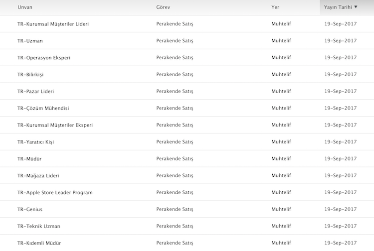 İş ilanları arasında; Kurumsal Müşteriler Lideri, Uzman, Operasyon Eksperi, Bilirkişi, Pazar Lideri, Çözüm Mühendisi, Kurumsal Müşteriler Eksperi, Yaratıcı Kişi, Müdür, Mağaza Lideri, Apple Store Leader Program, Genius, Teknik uzman ve Kıdemli Müdür yer alıyor.
