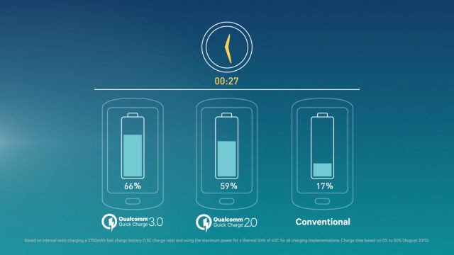 Qualcomm'un geçen sene tanıttığı yani mevcut olarak kullanılan şarj teknolojjisi Quick Charge 3.0 normal şarjlardan dört kat daha hızlıdır.